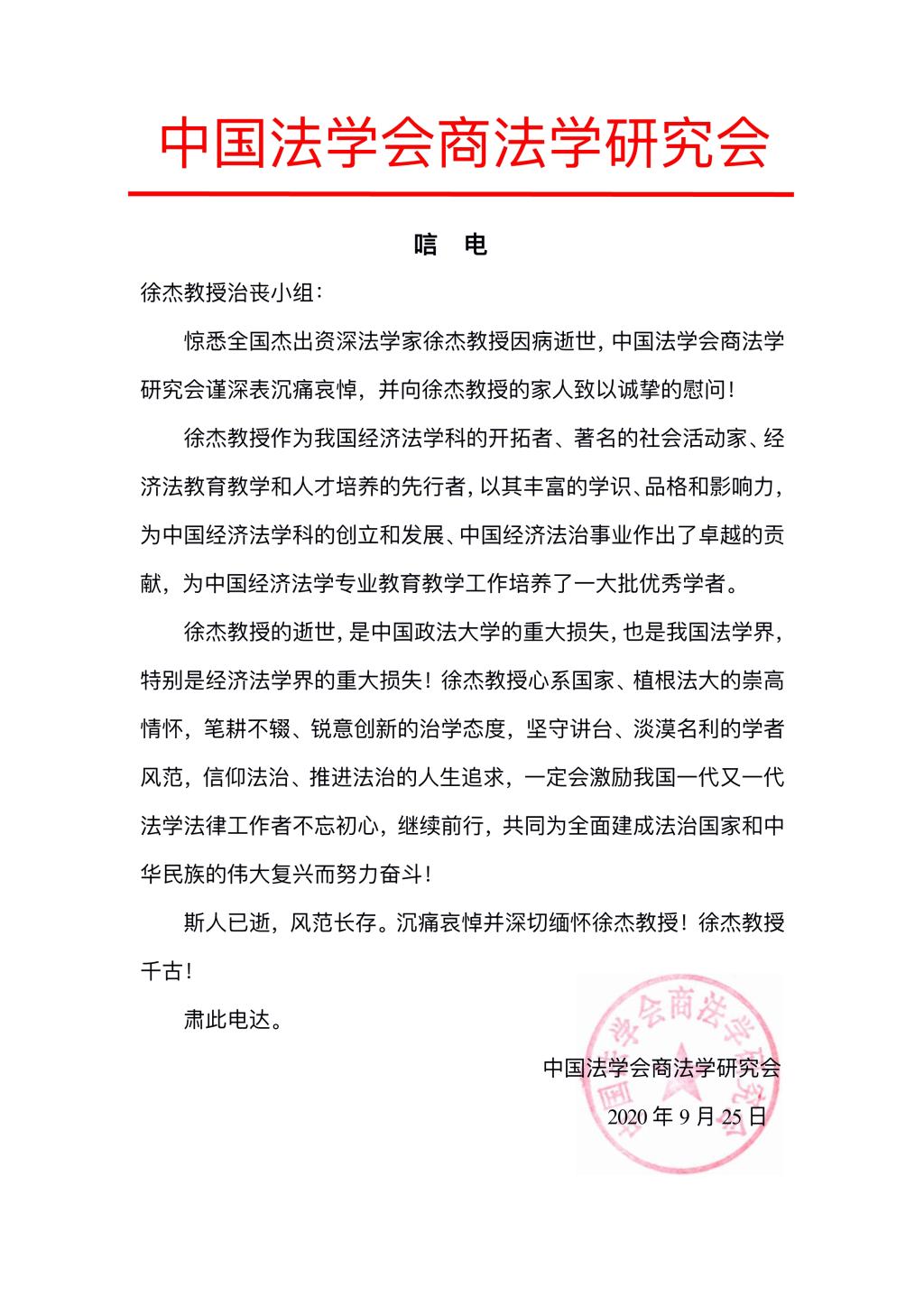中国法学会商法学研究会唁电