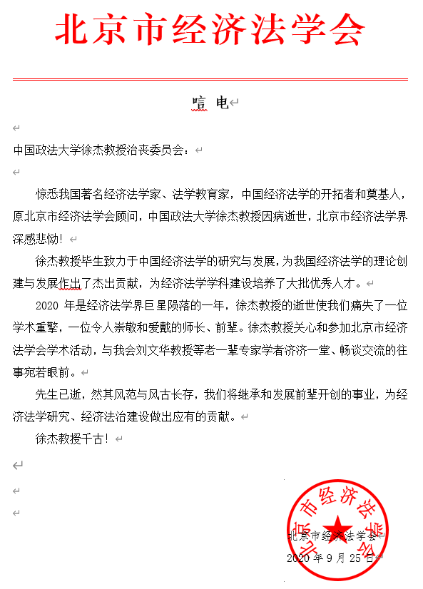 北京市经济法学会唁电