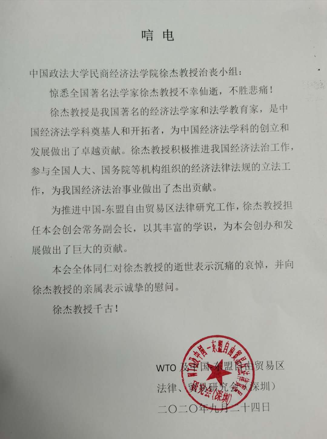 WTO及中国-东盟自由贸易区法律贸易研究会(深圳)唁电
