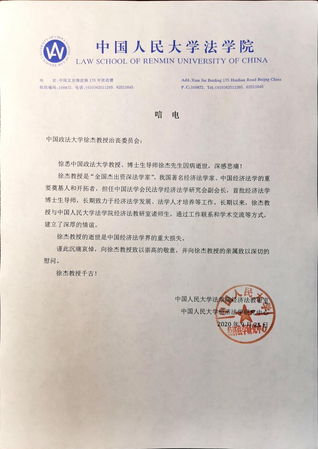 中国人民大学法学院经济法研究中心唁电