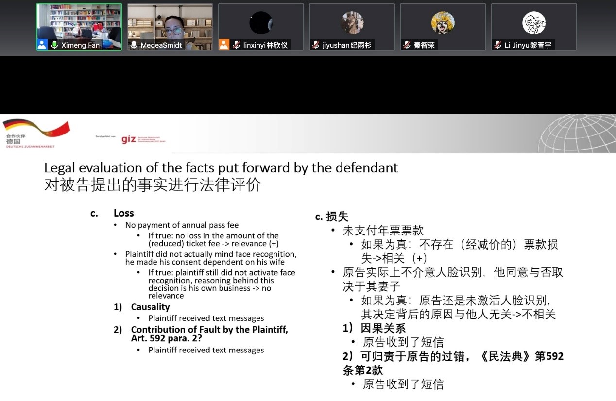 继2019年和2021年与GIZ中德法律合作项目就“请求权基础案例分析法”开展教学合作之后的第三度携手。通过合作,中德双方致力于在中国法框架下运用请求权基础的思维方式解析案例,共同探索适合中国法学现状的请求权基础中国化之路径。尤其是去年起引入授课内容的法庭报告技术,系在全国法学高等院校中首开先河,受到了好评与关注。