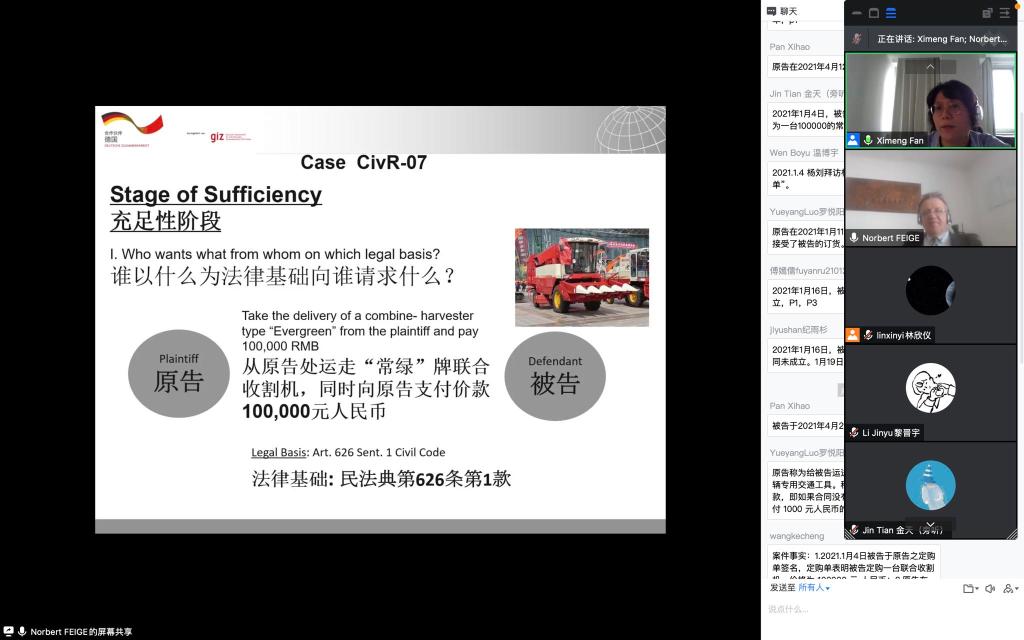 在为期两个月的课程中,GIZ法律专家团队在前两期授课的基础上,进一步结合《民法典》新规范适用,精心打造课程;并针对线上授课的特点,对于课堂互动与答疑方式进行调整,引入“双翻译”,即除了对课堂口授内容交传口译之外,安排专人负责课堂文字互动板块的即时翻译,便利了同学们对于在线授课内容的吸收理解,充分调动了同学们课堂参与的积极性。