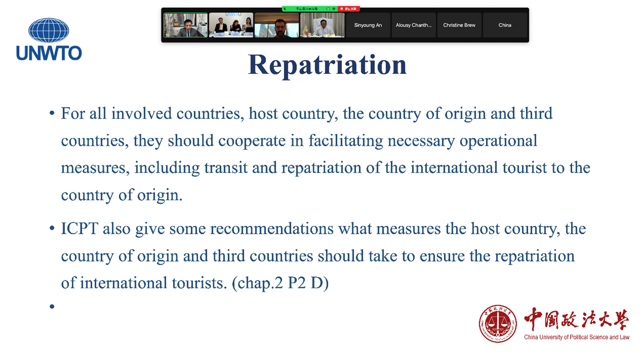 申海恩副教授作为亚太地区唯一应邀参加《游客保护国际守则》起草的咨询专家,对《游客保护国际守则》的起草背景、体系架构、规范宗旨、争议焦点以及规则形成过程都较为清楚并在相关领域有深入研究。鉴于此,联合国世界旅游组织邀请申海恩副教授在论坛上做了题为“Principles and Recommendations of the ICPT Relating to Emergency Situations(《游客保护国际守则》与紧急情势有关的原则与建议)”的报告。申海恩副教授以紧急情势下游客、服务提供者以及公共服务部门所面临的问题解决为思路,指出《游客保护国际守则》在事前预防、事中救助以及事后争议解决的全过程,贯彻了各方主体合作、协调、利益平衡以追求更加公平的风险分配原则。报告得到了与会各方的积极评价,为《游客保护国际守则》这一软法的广泛采纳做出了积极贡献。