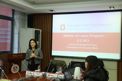 LL.M.项目宣讲会上,Fernández-Álvarez通过图文并茂的PPT,向同学们展示了俄亥俄州立大学的校园风光和基础设施,介绍了俄亥俄州立大学所在地哥伦布市的基本情况,并重点介绍了莫里茨法学院LL.M.项目的师资力量、专业方向、课程设置、学分要求等事项。她表示,法大与俄亥俄州立大学有着多年的友好合作关系,莫里茨法学院欢迎法大学子前往俄大深造。而后,孙依向同学们介绍了LL.M.项目的申请流程、奖学金数额、招生名额等情况。两位主讲人还耐心回答了同学们提出的疑问,取得了良好的互动效果。