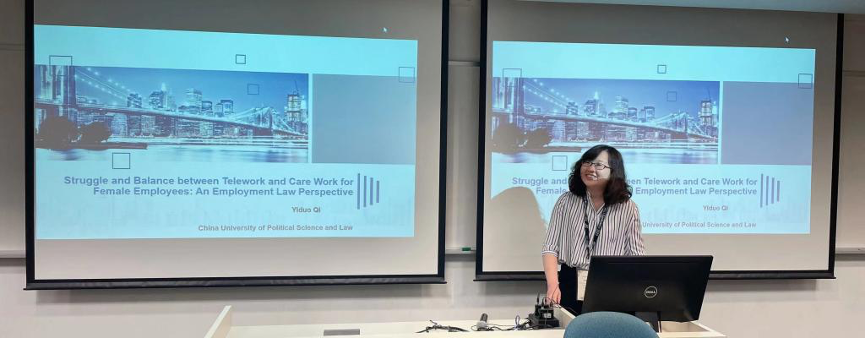 为期两天的会议分为七个单元,每单元下设六个主题研讨组,每组发言代表为3-5位,所涉领域涵盖各个部门法和多个法学交叉学科。在“劳动法”组别,博士研究生齐一多作题为“Struggle and Balance between Telework and Care Work for Female Employees: An Employment Law Perspective(女性劳动者远程工作与家庭照护劳动兼顾的劳动法路径探析)”的英文学术报告。与会者就报告内容进行了热烈的交流,就各个国家和地区女性远程工作的发展近况、如何通过政策鼓励企业出台远程工作政策等问题进行了深入探讨。