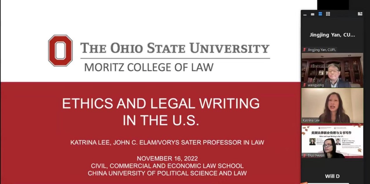邀请美国俄亥俄州立大学法学院Katrina Lee教授在线举办了题为“美国法律职业伦理与文书写作”精彩讲座。Katrina Lee教授现任美国俄亥俄州立大学法学院法学硕士法律写作项目主任、争议解决项目主任、美国法学院协会非诉讼争议解决分会执行委员会成员,是法律文书写作领域的知名学者。