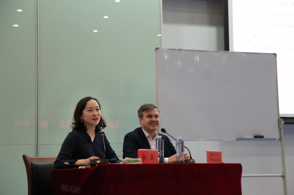 主讲嘉宾Marco Haase教授上台,他首先感谢了李校长和于院长的邀请。在简略介绍德国国际合作机构、德国的法学教育、德国的国家大考制度以及法学人才培养目的之后,Haase教授着重介绍了培养法学初学者正确的请求权基础思维的重要性。在金晶副教授精准的即时翻译下,Marco Haase教授以一个案例为出发点,在德国法的框架下展开关于请求权基础的相关知识的讲授,按照请求权基础三阶层理论逐步检索相关法律与法学要点,最终得出案例分析结果。