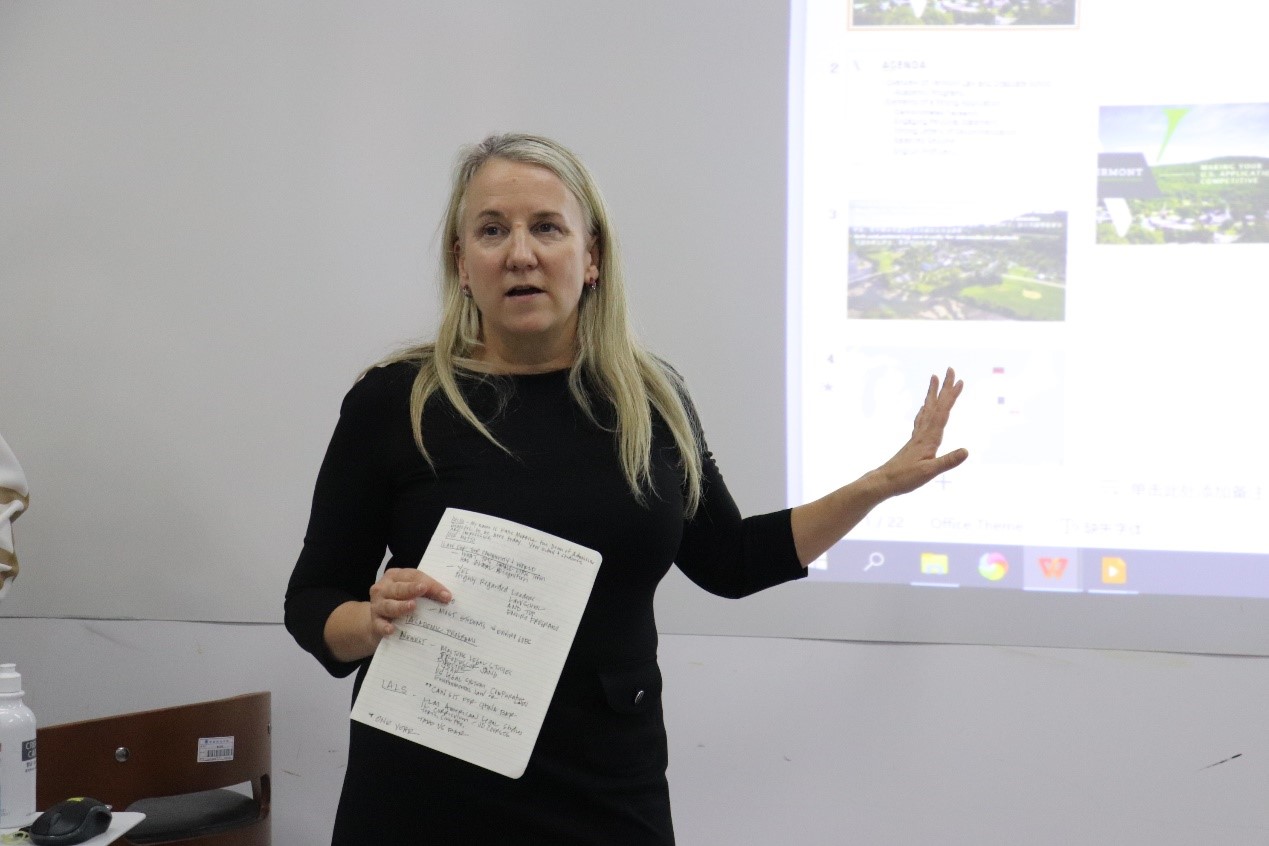 随后,Katie Merrill副院长详细介绍了佛蒙特法学与研究生学院的课程项目、申请流程及申请注意要点。她还向同学们介绍了申请美国高校通常所需准备的材料,提醒同学们关注美国联邦最高法院上述判决对申请人准备申请材料及高校录取可能产生的影响。