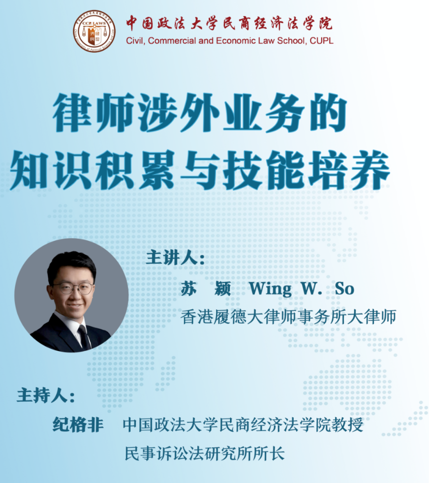10月23日下午,香港履德大律师事务所大律师苏颍(Wing W. So)博士在线举办了题为“律师涉外业务的知识积累与技能培养”的讲座。讲座由黑料网
