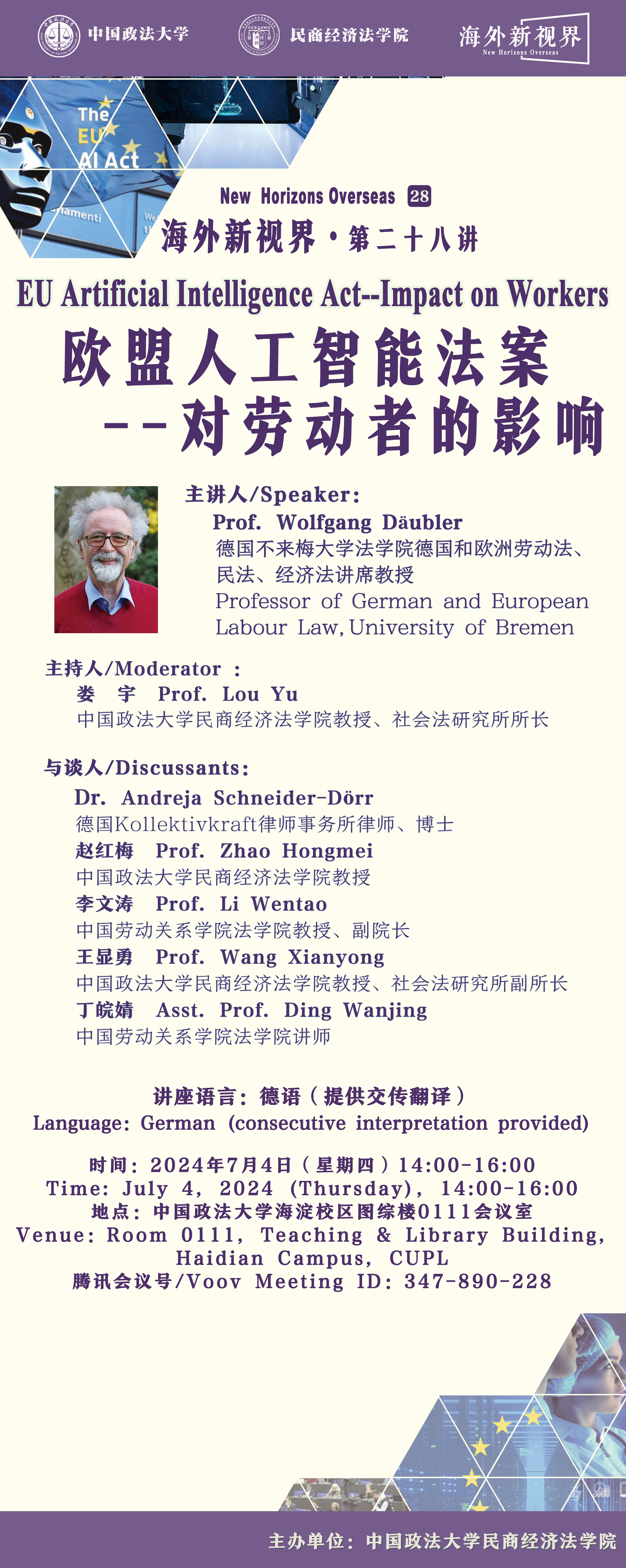 【讲座预告】“海外新视界”第二十八讲 | 德国不来梅大学法学院Wolfgang Däubler教授:欧盟人工智能法案——对劳动者的影响