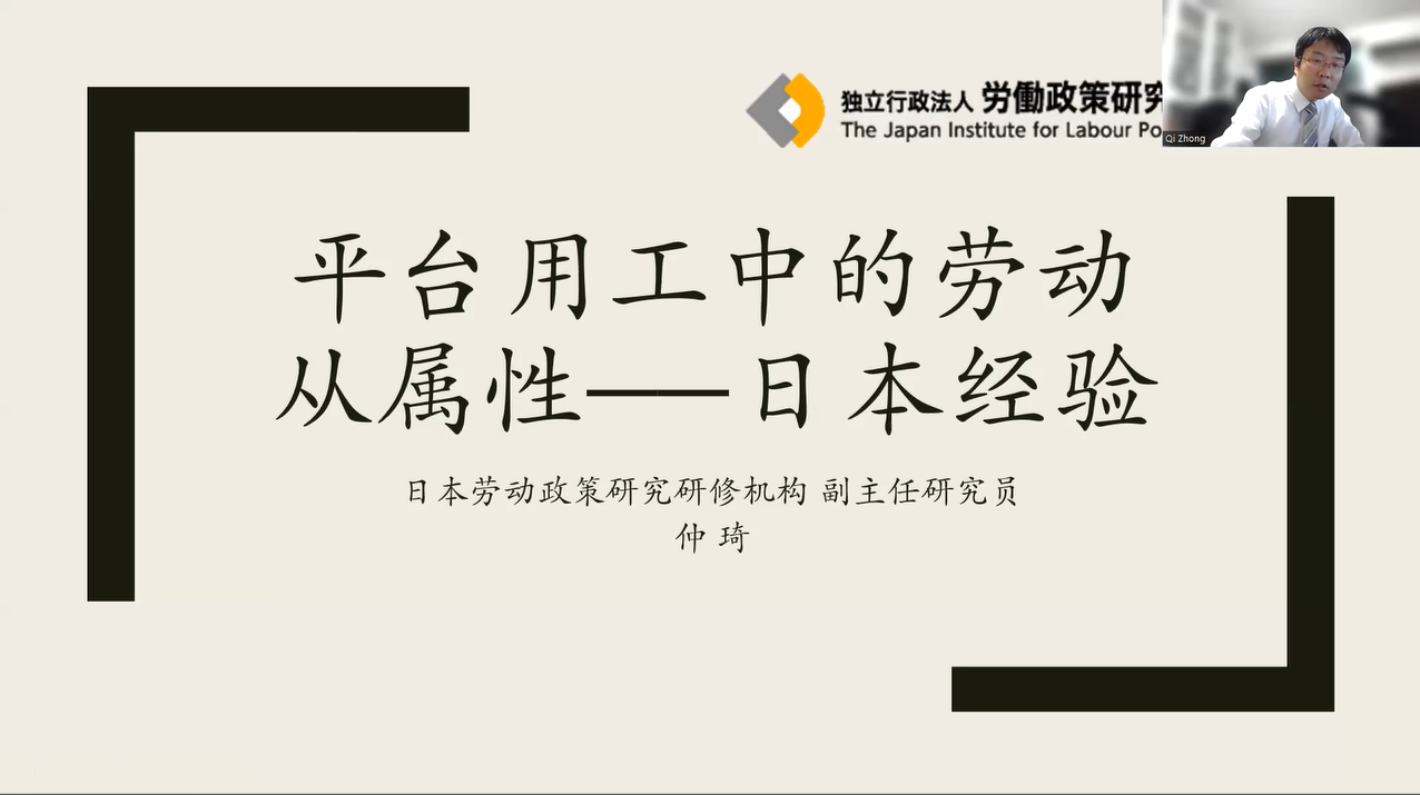 日本劳动政策研究研修机构副主任研究员仲琦的报告主题为“平台用工中的劳动从属性——日本经验”。他首先在比较法视野下分析了平台用工中劳动从属性的问题背景。随后,他介绍了日本法上的劳动者概念以及日本个别法、集体法上的劳动者认定基准与判断要素,并对日本Uber Eats骑手是否构成工会法上劳动者的判断案例作出评析。最后,他提出了在不同情形下分别讨论劳动者概念。
